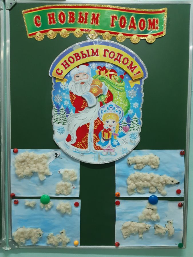 Дети под руководством воспитателя, используя бумагу, вату, краски и клей, изготовили замечательных северных медведей.